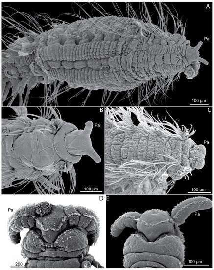 SEM micrographs of several Scalibregmatidae showing main prostomial diagnostic characters. (A) Pseudoscalibregma sp., Canary Islands, anterior end in ventral view, showing the pattern formed by the pads as well as the structure of the parapodia; (B) Asclerocheilus sp., Canary Islands, anterior end in dorsal view; (C) Asclerocheilus sp., northwestern Spain, anterior end in dorsal view; (D) S. lanzaroteum, anterior end in dorsal view; (E) A. cavernicola, anterior end in dorsal view. Notice the difference in the prostomial shape and appendages amongst (B–E), as well the presence of different development of the peristomium, and the presence of different types of chaetae. Abbreviation: Pa—prostomial appendages.
