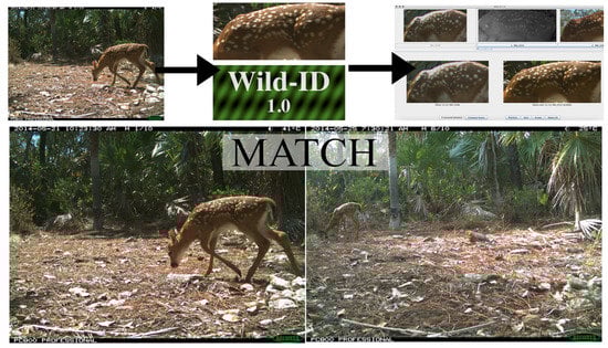 We extracted all key deer doe and fawn detection data from the cameras. Does were distinguished from bucks based on the absence of antlers or antler buds but were excluded in cases where the head was absent from the photo and other external genitalia were not visible. For fawn data, we only included young of the year with spots and selected one photo of either or both flanks of the fawn from each individual detection sequence. We cropped each of the images of fawns to contain only that flank for examination. We then entered all of the cropped photos of the left flanks of the fawns into Wild-ID 1.0 [], and the algorithm presented all potential matches. Once all potential matches were either manually accepted or rejected, Wild-ID created a matrix that congregated all the matches and individuals without matches. We then repeated this process for all the right flank images of fawns. All the individuals were either matched by both flanks or determined to only be identified by their left or right flank in cases where the individual was not detected by the paired camera trap, which we accounted for in our analyses. The workflow of individual identification is presented in Figure 1. We visually confirmed and validated all flank matches.
