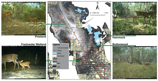 We measured habitat covariates that we identified a priori as potentially important drivers of key deer fawn abundance on Big Pine Key (Figure 2). We included the presence of human trails as a binary covariate if camera stations were located directly on (1) or off (0) trails, because we suspected that human foot traffic would directly affect doe habitat use and fawn abundance. Previous research has suggested that key deer prefer upland habitats including pine rocklands and upland hammocks [], so we used a LiDar-derived digital elevation model to examine these habitat associations at a high resolution. We calculated the mean elevation within a 25 m buffer centered on the cameras because elevation is the driver of habitat changes in the Keys, but also reflects the susceptibility of sites to flooding and saltwater incursion from storms and hurricanes []. We used a buffer-wide average because some sites were artificially elevated on old roads and berms. Human development is common throughout Big Pine Key, and we suspected that development would affect the distribution and abundance of key deer does and fawns [,]; therefore, we measured the linear distance of all camera sites to the nearest residential development. We further measured the distance to the road to account for road-specific effects on deer distributions over development alone.