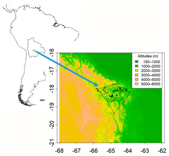 The slopes of the Andes are recognized as supporting the highest avian diversity in the world combined with high endemism rate but also more than 20% of threatened species [3]. In Bolivia, the red-fronted macaw (Ara rubrogenys Lafresnaye, 1847) is one of the 15 endemic species of this country [4]. Less than 30 years ago, A. rubrogenys was a little-known species [5]. It lives on the east Andean slopes of south-central Bolivia from 553 m up to 3094 m a.s.l. (Figure 1) and breeds between 1188 and 2696 m [6]. Its natural habitat is mainly semi-deciduous dry forest but this is most often severely degraded by pastoralism and by timber extraction into thorny scrubs with scattered trees [7]. While it was estimated that the threats were of limited extent in the early nineties [8], the status of the species worsens over the course of time with land conversion for agriculture, with poaching for illegal trade, with killing by farmers who consider them a pest and with poisoning with pesticides when they feed on the crops [6,9,10,11]. The small breeding population (only 67 to 136 pairs) in eight close areas was also pointed out as major risk which increases their extinction risk due to correlated environmental fluctuations [6]. It was found that the birds use agriculture-scrub ecotones more than the forests for foraging, probably because the forests do not offer enough resources. A. rubrogenys is now ranked as “Critically Endangered” in Bolivia [11] and on the International Union for Conservation of Nature Red list [12]. In addition, it could be particularly threatened by climate change. In its area of distribution, A. rubrogenys uses only terrains along river valleys for roosting, feeding, resting and nesting [9]. Most of the nesting sites are located in steep river cliffs but such environments are not necessarily available at higher altitudes given the magnitude of warming predictions. Climate change is supposed to particularly affect the tropical Andes and notably Bolivia [13]; while warming already averaged 0.1 °C/decade between 1939 and 1998, it accelerated to 0.33 °C/decade between 1980 and 2005. Climate change scenarios suggest warming as high as 7.5 °C by 2080 and important modifications of the precipitation regime with respect to pre-industrial times.