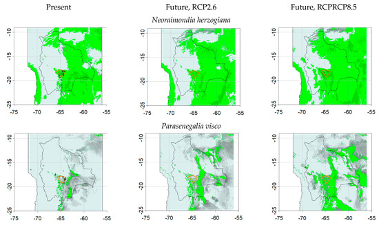 Examples of plant species distributions over Bolivia (Ara rubrogenys area delimited by orange lines) predicted by the DVM CARAIB (CARbon Assimilation In the Biosphere) for present and future climates under RCP2.6 andRCP8.5 forcings (+: occurrences of the species, light to dark color variation shows plant net productivity of the species fraction, in blue-gray between 0 and threshold of presence, in green between threshold and maximal value; the other plant species are shown in Figure S1).