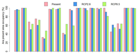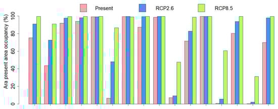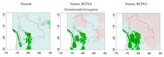 With the SDMs, changes predicted over Bolivia were more significant than with the DVM (Figure 5 and Figure 6 and Figure S3) but generally the presence also tended to spread. Over A. rubrogenys’ area, no clear trend emerged for occupancy or Px. Diversity over pixels (Figure S4) for the present was higher than with the DVM (mean: 13.2) but decreased to 12.6 under RCP2.6 and to 13 under RCP8.5 forcings. Indeed, more pixels lost species while the gains were more modest (Figure 7). Furthermore, less species than with the SDM had maximal altitude increase under the future climates (Figure 8).