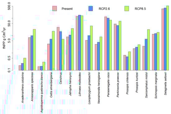 Area of Ara rubrogenys occupancy and fraction of the net primary productivity (fNPP) of the resource plant species predicted by the DVM CARAIB for present and future climates under the RCP2.6 andRCP8.5 forcings (Cnidoscolus tubulosus was not predicted on this area).
