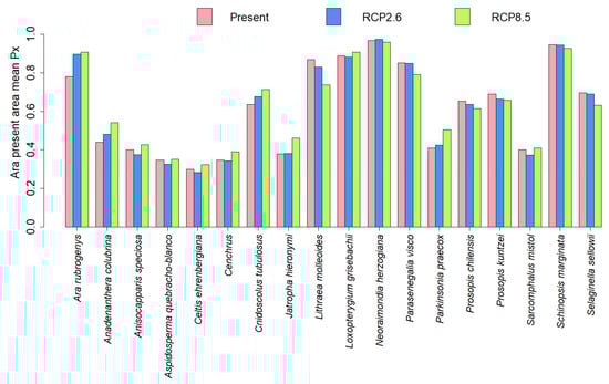Area of Ara rubrogenys occupancy and mean probability of presence (Px) of A. rubrogenys and of the 18 resource plant species predicted with SDM for present and future climates under the RCP2.6 andRCP8.5 forcings.