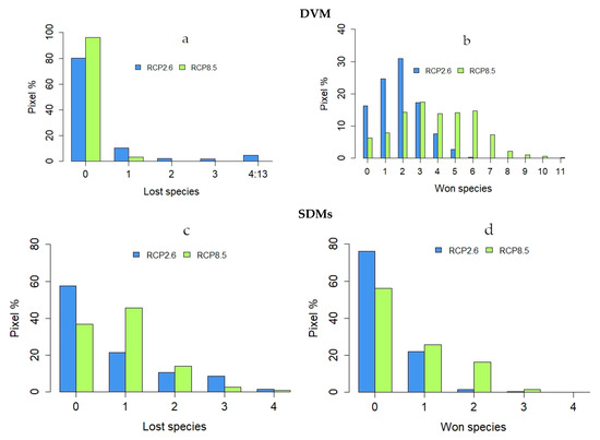 Proportion of pixels exhibiting a given number (0, 1, 2, etc.) of species lost (a,c) or gained (c,d) over the area of Ara rubrogenys under the RCP2.6 andRCP8.5 forcings compared to the present, for studies with the dynamic vegetation model (DVM: a,b) and the species distribution model (SDM: c,d).