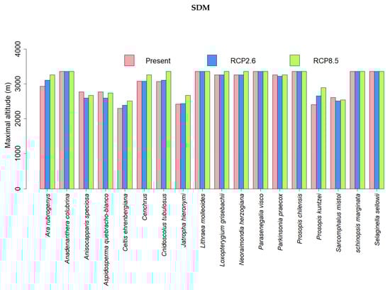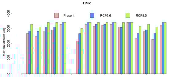 Maximal altitudes of the species over the area of Ara rubrogenys for present and future climates under the RCP2.6 andRCP8.5 forcings predicted by the dynamic vegetation model (DVM) and the species distribution model (SDM).