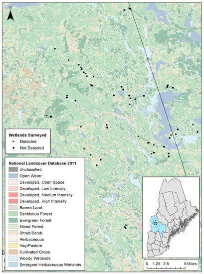 - Powell, L.L.; Hodgman, T.P.; Glanz, W.E. Home ranges of Rusty Blackbirds breeding in wetlands: How much would buffers from timber harvest protect habitat? Condor 2010, 112, 834–840. [Google Scholar] [CrossRef]