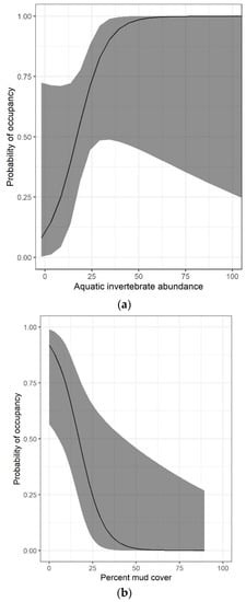 Relationship between probability of Rusty Blackbird occupancy and site covariates, percent cover of aquatic invertebrate abundance (a) and mud (b), with 95% confidence bands.