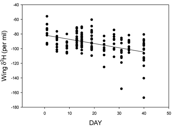 However, the majority of the assignment was consistent, with origins generally south of the Great Lakes and throughout the southeastern USA as generally reported in the literature. The sample size of this species and the long duration of sampling also allowed us to examine the pattern of migration through the site. After removing four outliers with δ2Hw values between −195‰ and −200‰ (i.e., indicating origins well north of the expected breeding range), we found a negative correlation between δ2Hw values and the day of sampling (Figure 2, p < 0.0001), which suggests a chain migration pattern with more northern-produced butterflies arriving later than more southern-produced individuals.