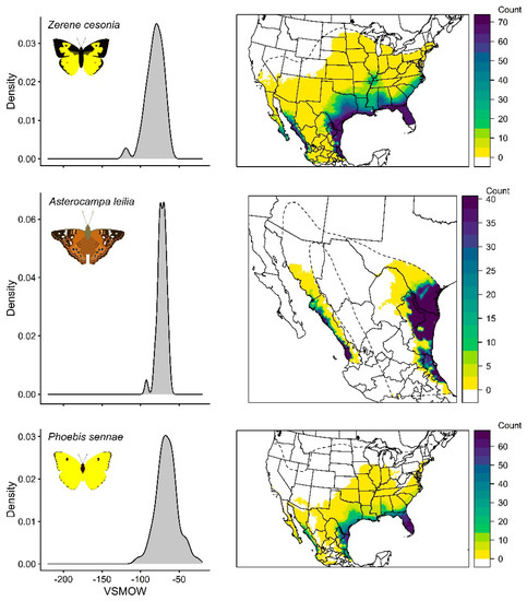 Due to the low sample size of this species (N = 14) and its narrow window of sampling, we did not produce an assignment to the origin map. Nonetheless, the species served as a useful “control,” with expected higher δ2Hw values (mean −70.2 ± 9.3‰) consistent with more southern (Mexican) origins (Table 1) Phoebis sennae.