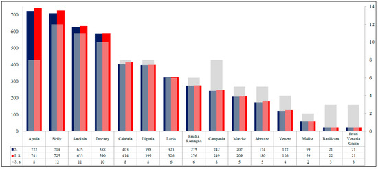 The Italian regions where most of the strandings occurred are Apulia (Apu), Sicily (Sic), Sardinia (Sar), and Tuscany (Tus), counting respectively 722, 709, 625, and 588 stranding events, with, respectively, 741, 725, 633, and 590 specimens. The regions Molise (Mol), Basilicata (Bas), and Friuli Venezia Giulia (Fri) with the lowest coastline length showed a lower number of stranded cetaceans.
