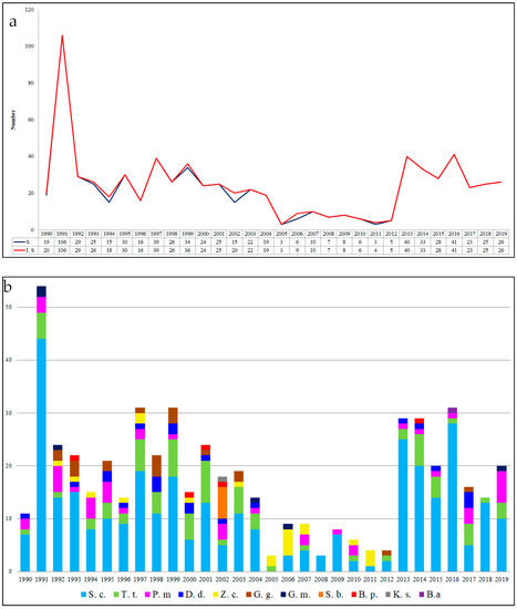 (a) Stranding frequency on Sicilian coast (1990–2019); S., Number of stranding events; I. S., number of stranded and entangled individuals; unidentified specimens included. (b) Number of stranded and entangled individuals for each species along the Sicilian coast per year (1990–2019). From the most to the less abundant S. c. = Stenella coeruleoalba; T. t. = Tursiops truncatus; P. m. = Physeter macrocephalus; D. d. = Delphinus delphis; Z. c. = Ziphius cavirostris; G. g. = Grampus griseus; G. m. = Globicephala melas; S. b. = Steno bredanensis; B. p. = Balaenoptera physalus; K. s. = Kogia sima; M. n. = Megaptera novaeangliae; B. a. = Balaenoptera acutorostrata; unidentified specimens not included.