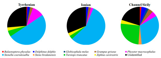 Figure 5 shows the different percentages of the species stranded in the different Sicilian coastal sectors. In particular, it should be noticed that in the Tyrrhenian sub-basin the most frequent species are the striped dolphin Stenella coeruleoalba (50%), the sperm whale Physeter macrocephalus (10%), and the common bottlenose dolphin Tursiops truncatus (5%); in the Ionian coast, the most frequent species are the striped dolphin Stenella coeruleoalba (56%), the common bottlenose dolphin Tursiops truncatus, and the Cuvier’s beaked whale Ziphius cavirostris (3%); in the Channel of Sicily, the most frequent species are the striped dolphin Stenella coeruleoalba (32%), the common bottlenose dolphin Tursiops truncatus (25%), the fin whale Balaenoptera physalus, and the sperm whale Physeter macrocephalus (5%). Regarding the unidentified carcasses, 26% were in the first sector, 30% in the second, and finally 20% in the third, respectively.