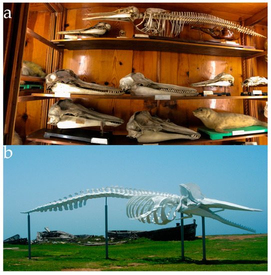 The Museum of Zoology “Pietro Doderlein” of the University of Palermo preserves the second most important cetological collection, albeit consisting of only 18 pieces (Figure 6a): two short-beaked common dolphins, Delphinus delphis, taxidermied; two common bottlenose dolphin, Tursiops truncatus, skulls; two Risso’s dolphin, Grampus griseus, skulls; one Cuvier’s beaked whale, Ziphius cavirostris, skull; one short-beaked common dolphin, Delphinus delphis, skull, and a partial skeleton. The specimens collected have a historical value, including a partial skeleton of a sperm whale, Physeter macrocephalus, that beached alive near the Stagnone of Marsala (TP) in December 1872, in a massive stranding event [58]. Other unexposed specimens are two fetuses of short-beaked common dolphins, Delphinus delphis, and two fin whale, Balaenoptera physalus, vertebrae.