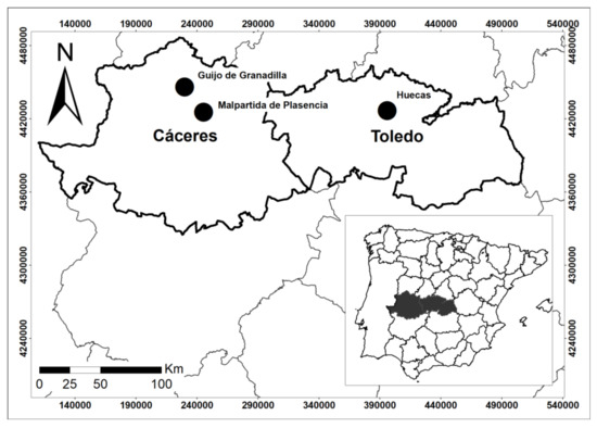 The data used in this study came from three localities of central and western Spain. The first one was Huecas, Toledo Province (39°59′ N, 4°13′ W), a flat agricultural land in which holm oaks are interspersed within cereal fields as isolated trees or in small plots (see [30] for a detailed description). In Huecas, acorn production and infestation rates by insects were monitored for six years (from 2008 to 2013) in 24 oaks. In three of those years, every single acorn was measured and opened to assess infestation, biomass loss and embryo predation. In addition, in two localities of the province of Cáceres: Guijo de Granadilla (40°8′ N, 6°7′ W) and Malpartida de Plasencia (39°56′ N, 5°58′ W), acorn production, infestation rates and the fate of infested acorns were measured for three years (2016 to 2018) in 16 and 8 trees, respectively. These last two places are human-made oak savannahs (so-called dehesas in Spain and montados in Portugal), traditional agroforestry systems in which free range livestock rearing is the main human use [25] (see Figure 1).