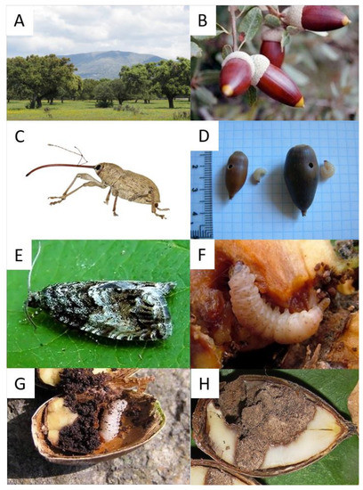 The communities of acorn-borer insects include species from different orders. The larvae of Curculio spp. (Coleoptera) weevils and Cydia spp. moths (Lepidoptera) complete their development within acorns feeding on the cotyledons. The identity at the species level may change, but the tandem Curculio–Cydia has been reported in oak forests worldwide (e.g., [15,18,19,20,21,22]). Curculio larvae are in most cases more prevalent than Cydia caterpillars; occurrence of other insect taxa is rare, with the exception of Conotrachelus spp. in North America [23].