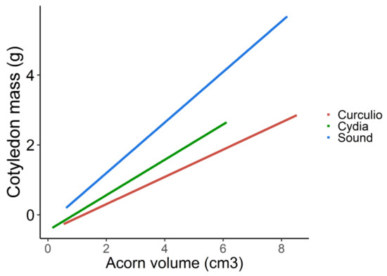 In spite of their larger volume, Curculio-infested acorns were not heavier than those attacked by Cydia because weevil larvae consumed more cotyledon. Cotyledon mass increased with acorn volume (F1,4490 = 6323.767; p < 0.001), but it differed between acorn types (F2,4490 = 2959.132; p < 0.001). For any given acorn volume, cotyledon mass was higher in sound acorns, in which nothing had been consumed by insects. Moreover, there were differences between those infested by insects as well. For a given volume, the weight of the cotyledon remains once the larvae had finished feeding was larger in acorns infested by Cydia (Figure 4). The interaction between the fixed factor and the covariate was significant too (F2,4490 = 340.612; p < 0.001; Figure 4).