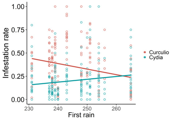 We considered the same variables that were considered in previous studies on the effects of meteorology on C. elephas phenology [11,12,27], namely total rainfall during the emergence period and the date of the first late summer rain. Total rainfall corresponds to the summed rainfall (L/m2) during the period in which most adult Curculio emergence is concentrated, from late August to October. This is also the period in which Cydia females are ovipositing; hence, we considered it appropriate to use the same variable for both. The first late summer rain is the date from August 4th onwards in which at least a daily precipitation of 1 L/m2 was recorded (please see [11] for a detailed explanation of the two variables).