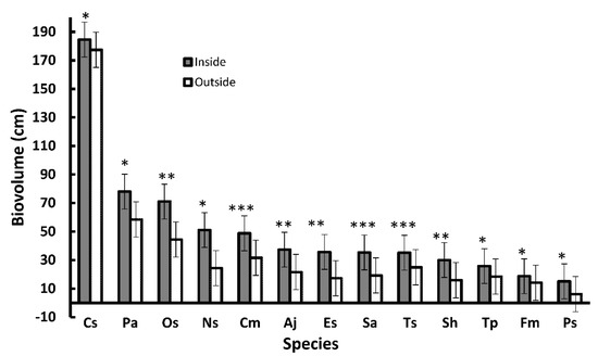 The mean biovolume of the species with significant higher values inside compared with outside the enclosures. Sh: Seriphidium herba-alba, Aj: Artemisia judaica, Cm: Chiliadenus montanus, Cs: Crataegus x sinaica, Es: Echinops spinosus, Fm: Fagonia mollis, Ns: Nepeta septemcrenata, Os: Origanum syriacum subsp. sinaicum, Pa: Phlomis aurea, Ps: Plantago sinaica, Sa: Stachys aegyptiaca, Ts: Tanacetum sinaicum, and Tp: Teucrium polium. Vertical bars are the standard errors of the means. *: p ≤ 0.05, **: p ≤ 0.01, and ***: p ≤ 0.001 according to the t-test.