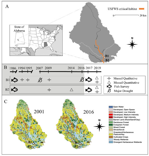 (A) Map of the sites sampled in Bogue Chitto Creek Watershed. (B) Timeline of the survey methodology used at each site and major drought events. Grey represents data considered historical. (C) Land cover in the Lower Bogue Chitto Creek watershed in 2001 and 2016.