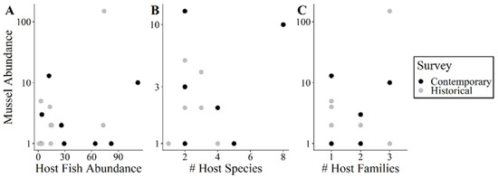 Host fish and mussel abundance relationships for 1986 and 1994 (historical data), respectively, and for 2017 and 2019 (contemporary data). The y axis is log10 transformed for visualization and data analysis. (A) Host fish abundance and relation to mussel abundance (F3,10 = 5.72, R2 = 0.520, p = 0.01). (B) Number (#) of host fish species and mussel abundance (F3,14 = 1.057, R2 = 0.009, p = 0.40); abundance of Amblema plicata was removed for analysis and visualization. (C) Number (#) of host fish families and mussel abundance (F3,10 = 2.02, R2 = 0.19, p = 0.17).