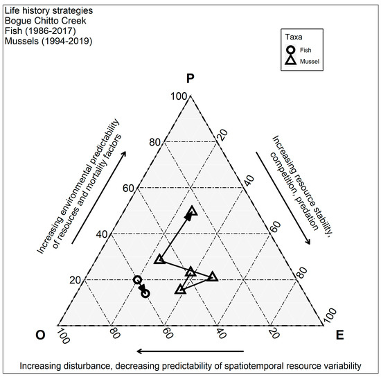 We used scientific literature and electronic databases [41,42] to comprehensively describe fish life history strategies in Bogue Chitto Creek (Table S2). Fish life history traits included life span (years), age at maturity (years), fecundity (total number of eggs or offspring per breeding season), and egg size (mean diameter [mm]). Additionally, we adopted methods from Winemiller (1989) [43] to calculate parental investment, a metric representing the total energetic contribution of parents to their offspring. Next, we assigned fish life history strategy endpoints and evaluated the fish life history continuum model of Winemiller and Rose [18] by plotting species’ positions in relation to three life history axes: (1) log10 maturation age; (2) log10 fecundity; and (3) log10 investment per progeny (calculated as log [egg diameter + parental care]; Figure S1). The equilibrium strategy is usually characterized by high parental care, low fecundity and low maturation while the opportunistic is associated with early maturation, low parental care and low fecundity. The periodic strategy is intermediate and is related to high fecundity, low parental care and late maturation [18,19]. Following life history classification assignment for mussels and fish, we calculated the proportion of species with each strategy for each time period and assessed temporal changes in each community simultaneously using a ternary diagram. Because qualitative mussel surveys were performed during all time points, we felt estimated species richness and therefore associated life history strategy composition, were accurately represented.