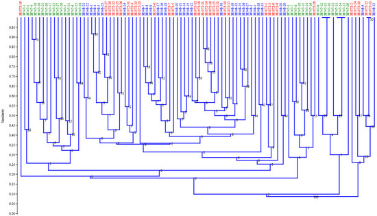 In this study, SRAP markers showed a magnificent performance in the amplification of Hail tomato landraces. The polymorphism (%), PIC, and DP were higher than the results of several SRAP marker research works [9,10,11,16,22], using other molecular markers, AFLP [23], ISSR [12,13,14,24], and RAPD markers [25,26]. Kaushal et al. [27] evaluated 25 tomato genotypes with 20 microsatellite markers and recorded a PIC value between 0.0 to 0.54 with an average of 0.27. An average of 0.63 was reported by Marin- Montes et al. [28] when evaluating the genetic diversity of 26 accessions of native Mexican tomatoes with 18 SSR molecular markers. The higher PIC values reported in this study confirmed that the selection of primers performed well in assessing genetic diversity patterns and helped in grouping-related accessions, and thus can be applied for germplasm characterization studies. It was assumed that markers with PICs of over 0.5 are efficient in genotype discrimination and useful for measuring polymorphism at a locus [29]. Botstein et al. [30] stated that a PIC value > 0.5 accounts for a highly informative marker, 0.5 > PIC > 0.25 for an informative marker, and PIC < 0.25 for a slightly informative marker. This wide variation in the results reported referred to the number of landraces used, DNA fragmentation method, and vast geographical distribution of the genotypes’ origins.