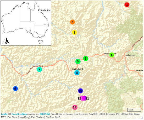 The location of the field sites for Acacia purpureopetala in far North Queensland, Australia. The map was produced in R using Leaflet [29] with an Esri World Street base layer. The numbering of sites following a North to South latitudinal change with site 1 = Springmount, 2 = Stannary Hill North, 3 = Stannary Hill South, 4 = Baal Gammon, 5 = Jumna, 6 = Dargo, 7 = Emuford, 8 = Ibis Dam, 9 = Gurrumba, 10 = Mt Misery North, 11 = Mt Misery East, 12 = Mt Misery Central and 13 = Mt Misery South.