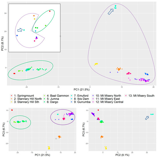 - Principal component analysis (Figure 2) found that most of the variations were explained by the first component (21%), which indicated two strongly differentiated genetic groups (Figure 2, green and purple shapes) with component two also clearly distinguishing a third small cluster consisting only of the individuals collected at Emuford (blue arrow). Principal component three further segregated Stannary Hill North (orange), Stannary Hill South (yellow), and Springmount(red) into distinctive small clusters.