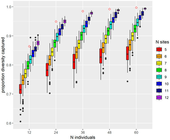 The proportion of genetic diversity captured, from that available amongst the genotyped samples, through different collecting strategies with different sample sizes (X-axis) and from a different number of randomly selected sites for A. purpureopetala. With a resulting sampling size of 24 individuals, sampling individuals from 12 sites captured significantly more diversity than from five sites (93 to 96% diversity vs 72 to 83%, p < 0.001). Sites were selected randomly from all available sites and individuals selected randomly from available individuals. Each box whisker plot summarises the sampling event across 100 randomisations. The red open diamond represents the “benchmark” of diversity to be captured across the entire dataset with each specified sample size.