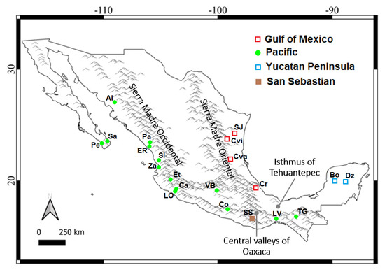 Map of the localities where samples of Natalus mexicanus were collected. Acronyms are as follows (locality, federal entity): Pe—Pescadero, B.C.S.; Sa—Santiago, B.C.S.; Al—Álamos, Son.; Pa—Pánuco, Sin.; ER—El Rosario, Sin.; SI—Santiago Ixcuintla, Nay.; Za—Zacualpan, Nay.; Et—Etzatlán, Jal.; LO—Los Ortices, Col.; Ca—Cardona, Col.; VB—Valle de Bravo, E. Mex.; Co—Colotipla, Gro.; SS—San Sebastián, Oax.; LV—La Venta, Oax.; TG—Tuxtla Gutiérrez, Chis.; Dz—Dziuché, Q. Roo; Bo—Bolonchén, Cam.; Cr—Carrizal, Ver.; Cva—Ciudad Valles, S.L.P.; Cvi—Ciudad Victoria, Tam.; SJ—Santander Jiménez, Tam. Symbols indicate the groups derived from genealogical analyses; major historical geographic barriers are indicated.