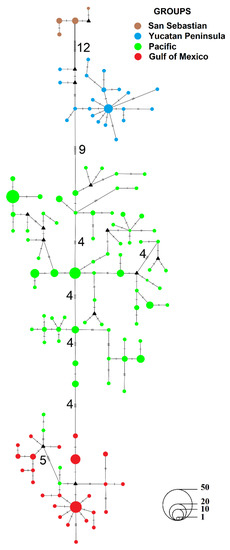 Median-joining network constructed from sequences from the mtDNA control region of Natalus mexicanus. The small lines connecting haplotypes indicate the mutation steps between them; small black triangles represent hypothetical haplotypes; the size of circles represents the frequency of each haplotype. Colors represent the following groups: Brown—San Sebastian; blue—Yucatan Peninsula; green—Pacific (included Pe locality); red—Gulf of Mexico. The lower right corner shows the scale for haplotype frequency.