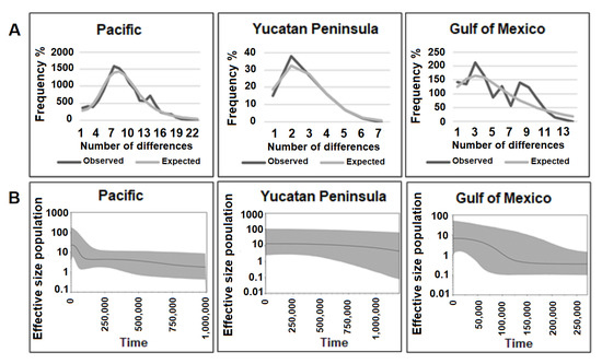 (A) Mismatch distribution and (B) extended Bayesian skyline plot from Pacific, Yucatan Peninsula and Gulf of Mexico.