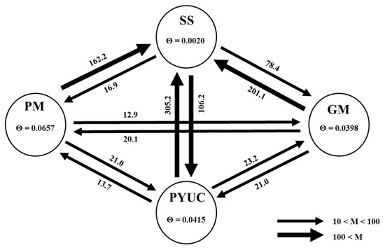 Bayesian inference indicated moderate to high levels of gene flow among the mitochondrial haplogroups (M = 12.9–305.4, Figure 4). Gene flow was symmetrical in GM vs. PM and PYUC vs. GM, and was asymmetric in PM vs. SS and PYUC vs. SS. The lowest levels of gene flow were observed between GM vs. PM, PM vs. PYUC, and GM vs. PYUC (Figure 4). The female effective population size varied among haplogroups (0.0020–0.0657; Figure 4).