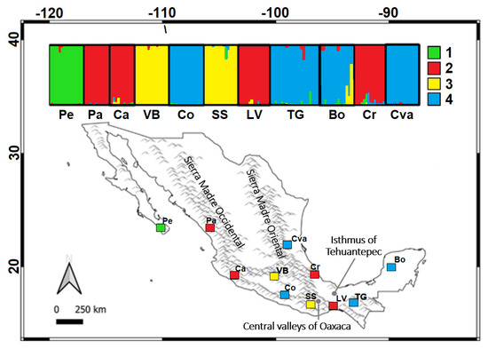 The STRUCTURE analysis identified four genetic groups (K = 4), which differed in composition from those obtained with mtDNA: (1) Pe locality (Baja California Peninsula); (2) localities Pa, Ca, LV, and Cr (Pacific and Gulf of Mexico slopes); (3) localities VB and SS (valleys of Mexico and Oaxaca, respectively); and (4) localities Colotipla (Co), Tuxtla Gutiérrez (TG), Bolonchén (Bo), and Ciudad Valles (Cva) (Pacific and Gulf of Mexico slopes, and Yucatan Peninsula) (Figure 5). Genetic differentiation values between localities were high and significant (FST = 0.147 and RST = 0.486; p < 0.05) (Table 4). HO values ranged from 0.404 to 0.681 and HE from 0.585 to 0.787.