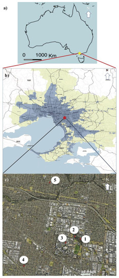 Map of the study area. (a) Map of Australia showing the geographical location of the city of Melbourne (solid yellow circle) (b) Map showing the urban area of Greater Melbourne (dark blue shaded region) within the urban growth boundary (light green shaded region) and the sampling locations (Source: https://www.sro.vic.gov.au/greater-melbourne-map-and-urban-zones (accessed on 28 May 2019)). (c) Aerial view of the study location and sampling sites. The numbers and red marks show the study sites within three different locations (details in sect 2.1 Study area). Sites 1 and 2 have access to remnant native habitat (Jock Marshall Reserve), sites 4 and 5 are residential urban environments; site 3 data collected not considered in main manuscript. Maps a and c were prepared in R v3.5.1 using packages ‘maps’, ‘dismo’, and ‘raster’ [45].