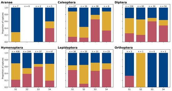 The initial model included site as a random factor, but its estimated variance was close to zero. Variance estimates close to zero are common when there are not many levels within the random effect, in which case it is better to treat the variable as a fixed term within the model [76]. Site as a fixed term in the generalized linear model (GLM) was found to be non-significant (likelihood ratio χ2 < 1.00, p ≈ 0.999), and so it was not included as a predictor in the subsequent, reduced models. The effect of the remaining fixed terms, sampling time, location, and insect order, along with their respective two- and three-way interaction terms, were tested using a model simplification technique [77] assuming a quasi-binomial distribution to account for overdispersion [75,78]. Model selection stopped once we found a significant interaction term. Our final model describes the variation in the proportion of captured insects as a function of insect order, location, and a third term describing the interaction between these two variables.