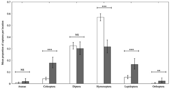 Pairwise location comparison revealed significant differences in the proportion of captures for four of the six respective orders between locations (Figure 3). In particular, we observed significant differences in the proportion of captures of Coleoptera, Hymenoptera, Diptera, Lepidoptera, and Orthoptera (p < 0.006) (Table 1). We found that a higher proportion of Hymenoptera insect orders was captured in the location containing native vegetation (Location 1) than in the residential location (Location 2), whilst the opposite effects were observed for Coleoptera, Lepidoptera, and Orthoptera (Figure 2 and Figure 3, supplementary Table S2 raw data). The proportion of Araneae (spiders) and Diptera seemed to be similar between the two locations, although the low number of captures of the former group suggests that this result should be treated with caution.