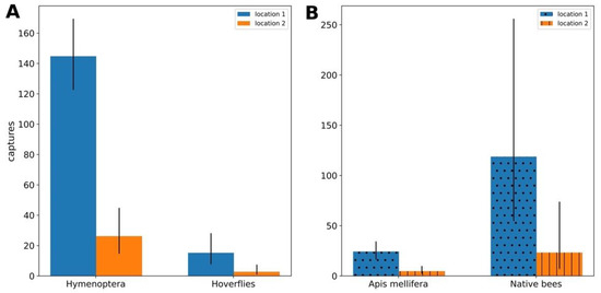 Comparison of pollinators captured at the location with remnant native vegetation (location 1, blue bars) and the urban, residential location (location 2, orange bars). Panel (A): mean number of hymenopterans and hoverflies captured at both sites. There were significantly more hymenopterans captured in location 1 than in location 2 (p < 0.001), with significantly more hymenopterans captured at both locations (p < 0.001). Panel (B): mean number of European honeybees (Apis mellifera) and native bees captured at the two locations. Significantly, more native bees than European honeybees were captured at both locations (p < 0.001), with more captures being made at the location with remnant native vegetation (p < 0.001). Error bars represent 95 % confidence intervals of the mean in all cases. Refer to the result section for details on the statistical analyses.