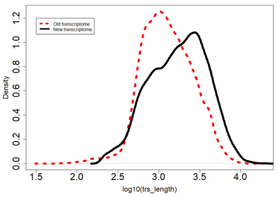 The transcript length distribution of the new (solid line) and old (discontinuous line) transcriptomes. The new version has fewer and longer transcripts.