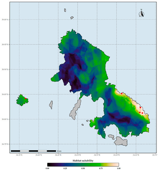 Habitat suitability map of Aethionema retsina under current climate conditions based on the WorldClim climate database. Red dots indicate the occurrences of Aethionema retsina in Skyros and Skyropoula. Threshold for binarization: 0.998.