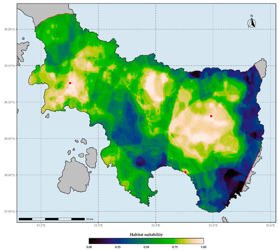 Habitat suitability map of Allium iatrouinum under current climate conditions based on the WorldClim climate database. Red dots indicate the occurrences of Allium iatrouinum in southern Evvia. The red lines delineate the potential distribution are of Allium iatrouinum based on the alpha-hull method. Threshold for binarization: 0.999.