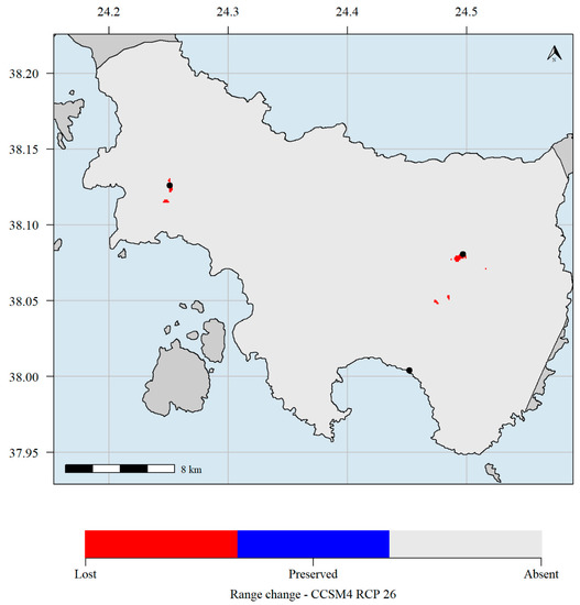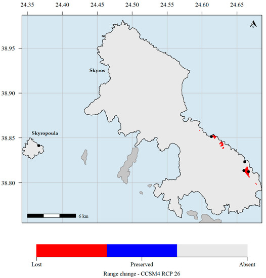 Predicted potential distribution map for 2070 and the CCSM4 global circulation models (GCM) and the representative concentration pathways (RCP) 2.6 scenario. Red grid cells: Aethionema retsina is currently predicted to occupy these areas but will not occupy them in the future. Blue grid cells: Aethionema retsina is currently predicted to occupy these areas and will continue to occupy them in the future. Light grey grid cells: Aethionema retsina is not currently predicted to occupy these areas and it is not predicted to occupy them in the future. Black dots indicate the occurrences of Aethionema retsina in Skyros and Skyropoula. Climate data refer to the WorldClim database. Please note that the black dots in Skyropoula and south-eastern Skyros hide the red cells where the species is predicted to currently occupy.