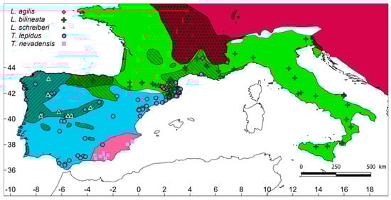 South-western Europe encompasses a relatively rich reptile fauna, favored by its topographic heterogeneity, insularity and mild climate conditions [9]. In this region, several groups of phylogenetically related species display complex patterns of overlap structured by environmental gradients or by interspecific interactions [10,11,12]. In this study we evaluated the niche occupancy patterns of five species of large lacertid lizard (i.e., adults having >75 mm snout-vent length) that occur in south-western Europe and comprise a monophyletic group [13]. We focused on phylogenetically related species because stronger competitive interactions among them can be expected [14]. The target species in this study included one species having a broad circumboreal distribution, Lacerta agilis (Linnaeus 1758), two western Mediterranean endemics Lacerta bilineata (Daudin, 1802) and Timon lepidus (Daudin, 1802), and two Iberian endemics Lacerta schreiberi (Bedriaga, 1878) and Timon nevadensis (Buchholz, 1963). Given these substantial chorological differences, it was also expected that these species would diverge in their environmental associations. For example, T. nevadensis mainly occupies semi-arid steppe-like habitats, L. agilis appears to be confined to sub-alpine meadows, and the other species are possibly more habitat generalists [15,16].
