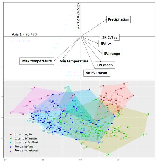 The first two axes of the OMI explained 96.98% of total inertia (axis 1: 70.47%, axis 2: 26.51%). The first axis described a gradient from higher to lower temperature and precipitation and differentiated those species that occur under humid-cold conditions from those that occur under hot-dry conditions (Figure 2). The second axis described a transition between habitats having different vegetation cover, typically distinguishing habitats having a relatively high EVI and a low seasonal coefficient of variation (CV) (e.g., forests) from those having a relatively low EVI and a high seasonal CV (i.e., grasslands/cultivated lands; Figure 2). The genus Timon was separated from the genus Lacerta mainly along the first axis, the former showing a positive association with dry-warm climates (Figure 2). The niche indices indicated that a large part of the variation in the occurrence of species was explained by the environmental variables, with residual tolerance values between 19.2% (L. agilis) to 66.9% (L. schreiberi) (Table 1). In general, the species showed moderate to high distances from the environmental centroid, ranging from 20.2% (L. schreiberi) to 74.4% (L. agilis) (Table 1), which indicated that they occupied confined subspaces within the available environment (Figure 2). The tolerance indices consistently showed moderate to low values, ranging from 22.6% (T. lepidus) to 6.4% (L. agilis) (Table 1), indicating that these species differed in their niche sizes (Figure 2).