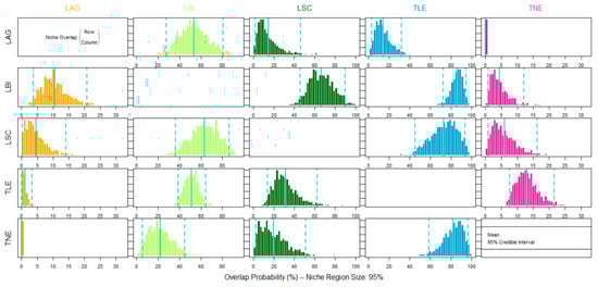 Ecological overlap between large lacertid species in southwestern Europe, estimated with the posterior distribution of the probabilistic niche overlap metric (%) for the niche region of alpha = 0.95. The posterior mean and 95% credible intervals are shown in sky blue lines.LAG = L. agilis; LBI = L. bilineata; LSC = L. schreiberi; TLE = T. lepidus; TNE = T. nevadensis.