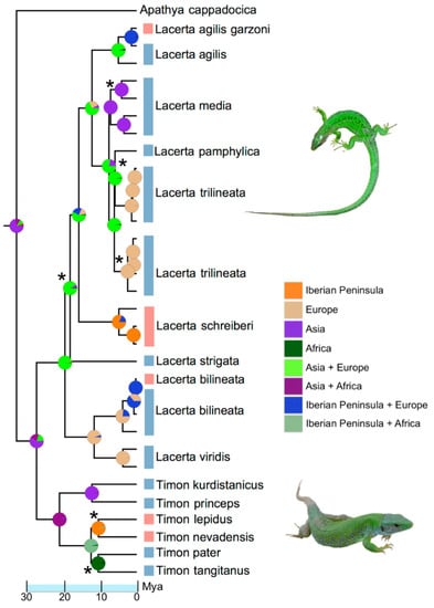 Phylogenetic relationships among Lacerta and Timon species estimated using Bayesian analysis on Cytochrome b and 12s mitochondrial genes. Asterisks denoted those nodes supported by posterior probabilities lower than 0.90. Pie charts depicted the probability of occurrence of the ancestors within the eight areas defined by the BioGeoBears analysis.