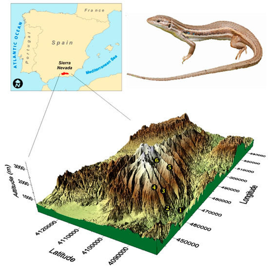 The three-dimensional map (bottom panel) is a representation of the Sierra Nevada Mountain and displays the location of the six sites sampled during this study along the elevational gradient: 300 (1), 700 (2), 1200 (3), 1700 (4), 2200 (5), and 2500 (6) m asl. The location of Sierra Nevada in the Iberian Peninsula (top, left) and an image of the lizard (top, right) are also shown.