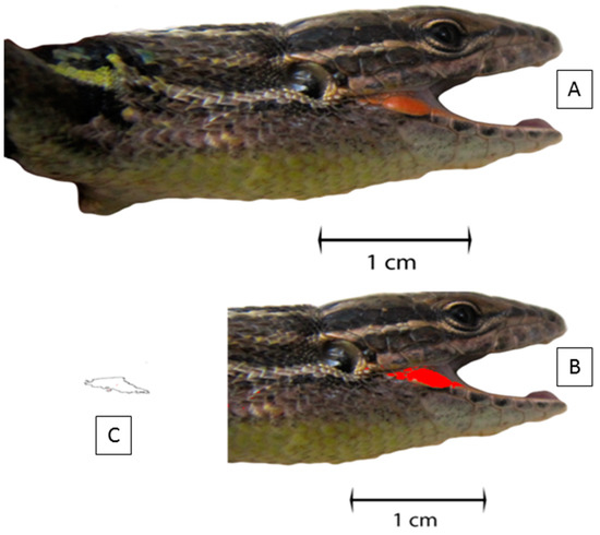 Representation of procedures for quantifying the coloured commissure area, using the software Image J (version 1.60). (A) First, we performed lateral photographs of the lizard with the mouth opens; (B) Second, we selected the coloured area with the “Colour threshold” tool; (C) Third, we measured the area with the “Analyse particles” tool.
