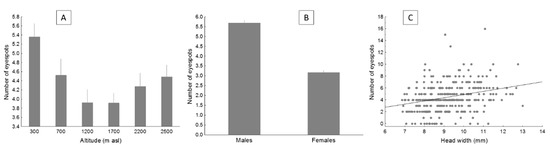 The average number of eyespots (with SE) in the flanks of the lizard P. algirus, according to altitude (A) and sex (B), and the relationship between the number of eyespots and head width (C). Notice that raw data are shown, but statistical analyses were performed with transformed data when necessary.